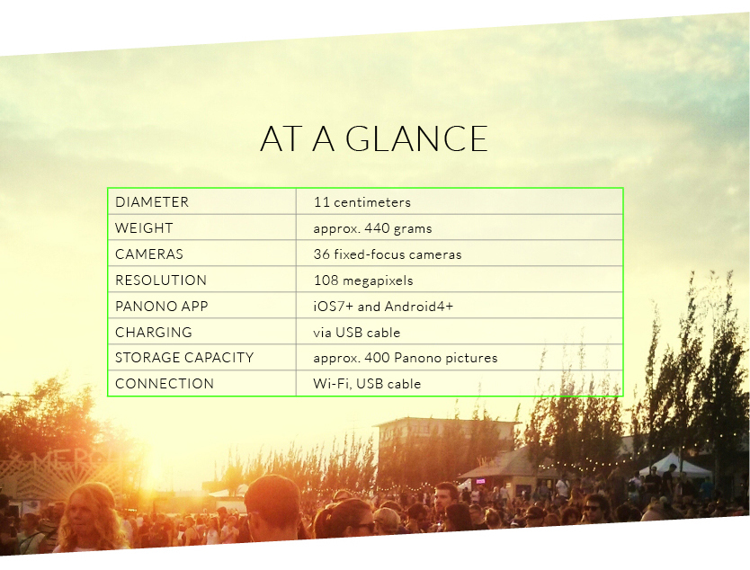 A 360° × 360° preview is instantly sent to your smartphone or tablet via WiFi. The 36 images are then pushed to the Panono Cloud where they are seamlessly stitched together and available for uploading to the web or viewing in the Panono app on your mobile device (Android and iOS). The Panono itself is capable of storing 400 shots that can be downloaded to your computer via USB or WiFi. You can even play with the single files and stitch them together yourself if you so choose.