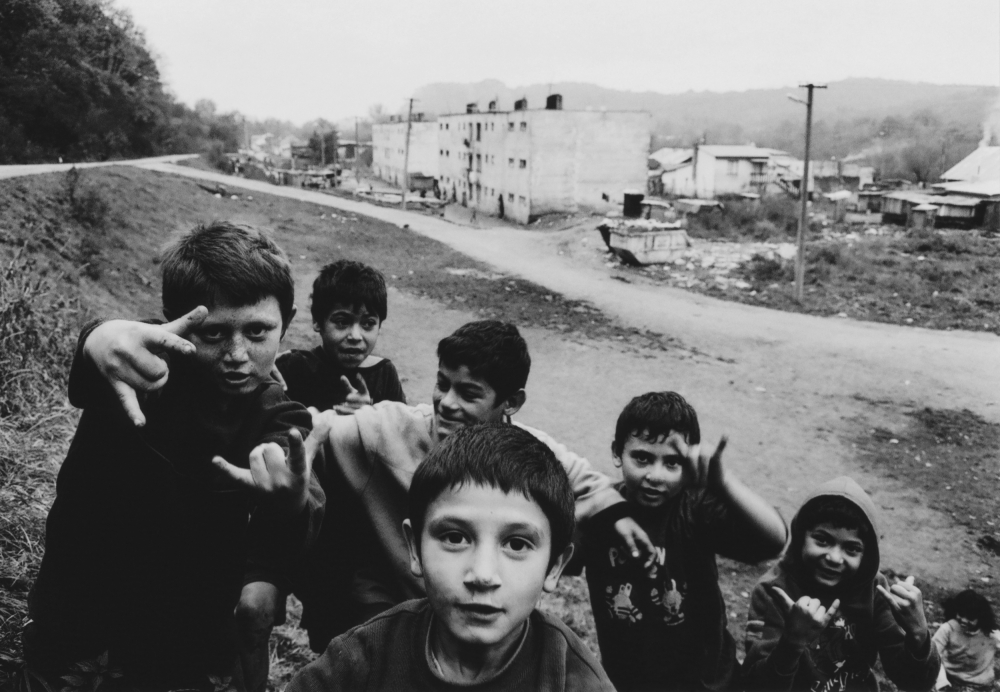 I very much like the composition of this image. It shows the boys in their environment. Without those desolate apartment buildings and their cluttered environment the photo would have been incomplete. Placing the boys in the foreground has been a good choice. It gives the photo its dynamic look.