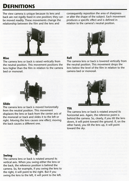 For a landscape theme, maybe also for still life close-up work, the one standards adjustment that I find most useful and important is the ability to have everything in focus right from the foreground underneath the lens all the way to infinity. That adjustment is done by tilting the front standard forward. Play with it, refocus, until you have a perfectly focused image on the ground glass from top to bottom.