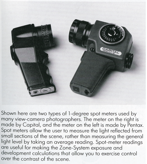 - And of course don't forget the light meter; any one will do, but a spot meter for landscape outdoor work, is the most useful.