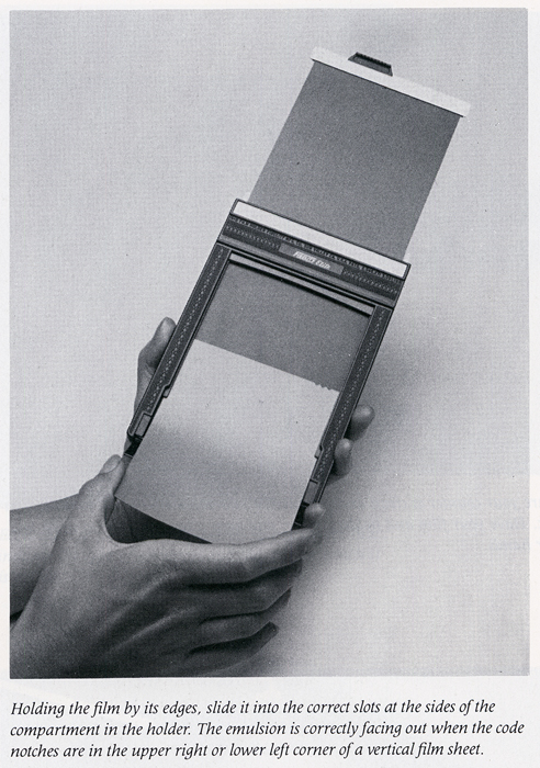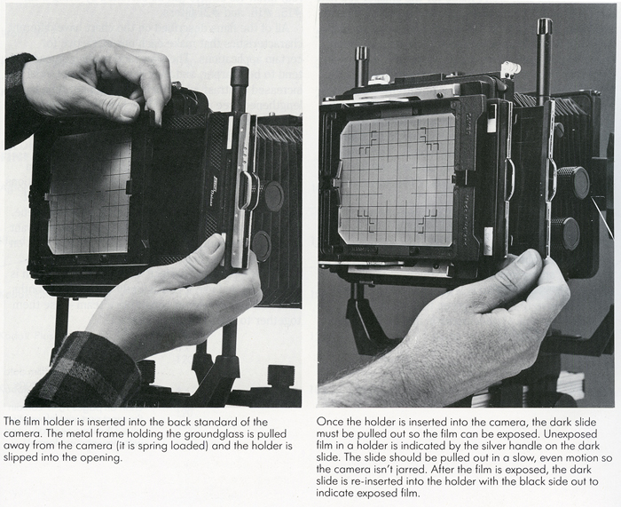 - Close the lens, cock the shutter, and insert the film holder.