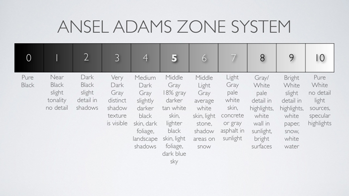 If there is more, then it will be a high contrast image , and you willunderdevelop your negative to compress the scale. In this case under develop by 30% (30% less time than standard development time) for each additional zone apart. If there is less contrast, overdevelop. Take the meter reading on the dark areas. The light meter will always place the result in a middle range. Close your measure two points, placing it on zone 3. There are roughly 11 zones. Zone 0 is pure black, transparent on the negative. Zone 10 is pure white, black on the negative. Zone 5 is important, being middle gray, and that is where the exposure meter places its reading. Also important are zones 3, black with detail, and 7, white with detail. We want our negatives to be readable between these five zones, from 3 to 7.