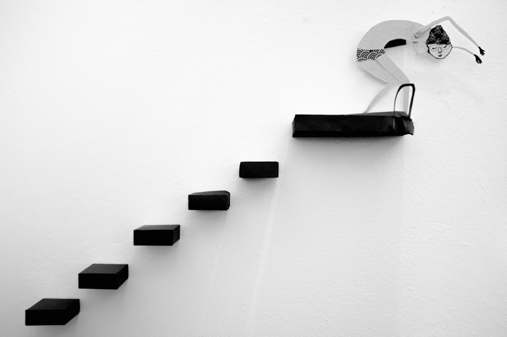 The photo shoot was planned and executed one afternoon. After establishing my initial concept, I envisioned a scene that would incorporate the feelings that I wanted to portray in the image. I constructed the set using sheets of cardboard for the steps and glued them to the wall. The illustration of the swimmer was created by my daughter after I explained to her what I was trying to accomplish.