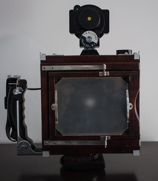 As can be seen, both viewing systems are redundant. Only the top viewer is enough, and it's what I use most of the time, as there is no need to use the ground glass for focusing. The film holder back could have been replaced for a simple holding device. Still it's always wonderful to view the framed image on a ground glass.