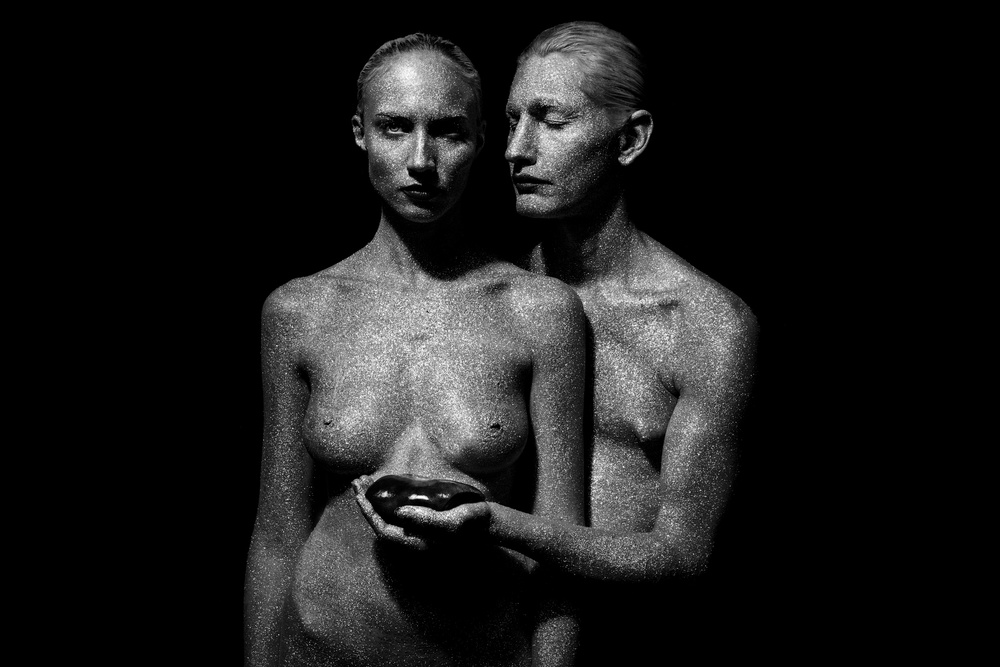 Gautier created the idea of the glitters together with Cassandra Ceschi. She was there from the real beginning of New Humans’ story. Samantha and Cassandra work as a team, and became Gautier's core « MUA » team. Both did a hell of a job with the complex make-up of four models that day. Cynthia is responsible for everything to do with hair. From her wide skill set she’s also a wig-maker and creates a lot of things for the head beyond just dressing hair. I observed Gautier, his interaction with his team. When he shoots, he just gives short commands. After a few shots are done, the team has a look, or at least a few of them, always Alexia. Things might be rearranged. Philippe is Gautier's first light assistant, he’s a passionate people photographer himself. From a glimpse at a frame he immediately knows what’s wrong. And Ema with her good instinct of sceneries does wonderful backstage photography. Many sessions are documented on the artists websites and on YouTube.