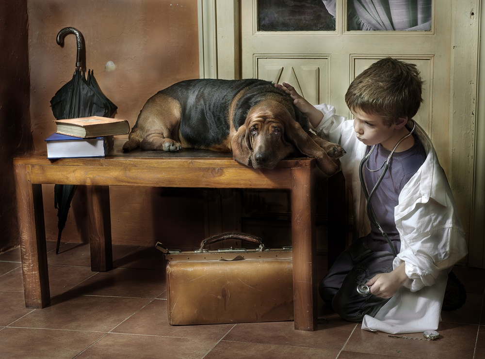 I had the location — a room in my house (which is quite old) with an antique door. I had the props. I had the human model (my son) who is at a perfect age to take pictures and he enjoys it. But I was missing one of the main characters — the animal. I could not find a suitable animal to be the patient. Several months passed, and I still was not able to complete the scene since the most important part was missing.