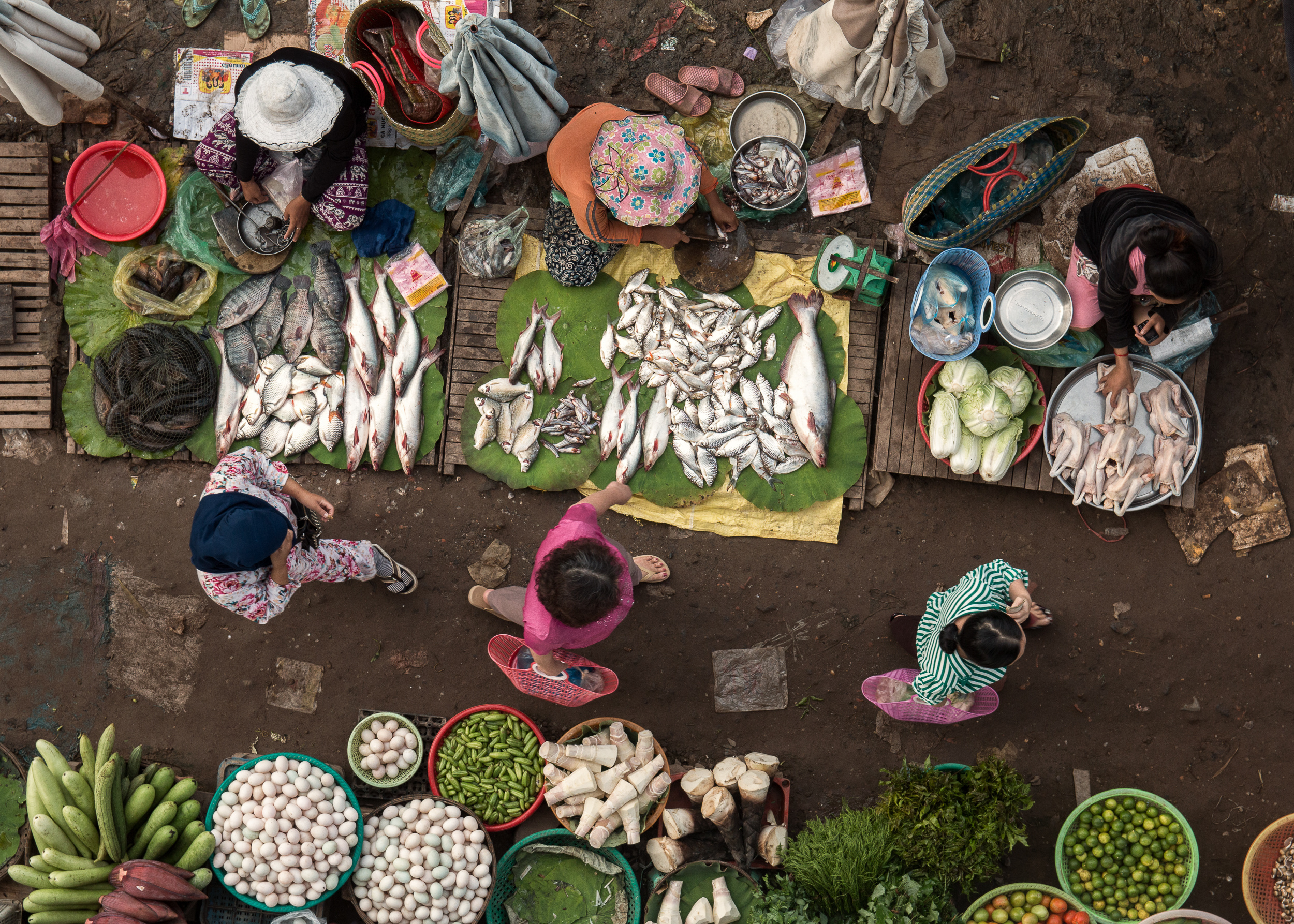 One of that is Kampong Cham in the north of Cambodia, a peaceful place on the banks of the Mekong River. In photo traditional local small fish selling spot on the river bridge near Kampong Cham.
