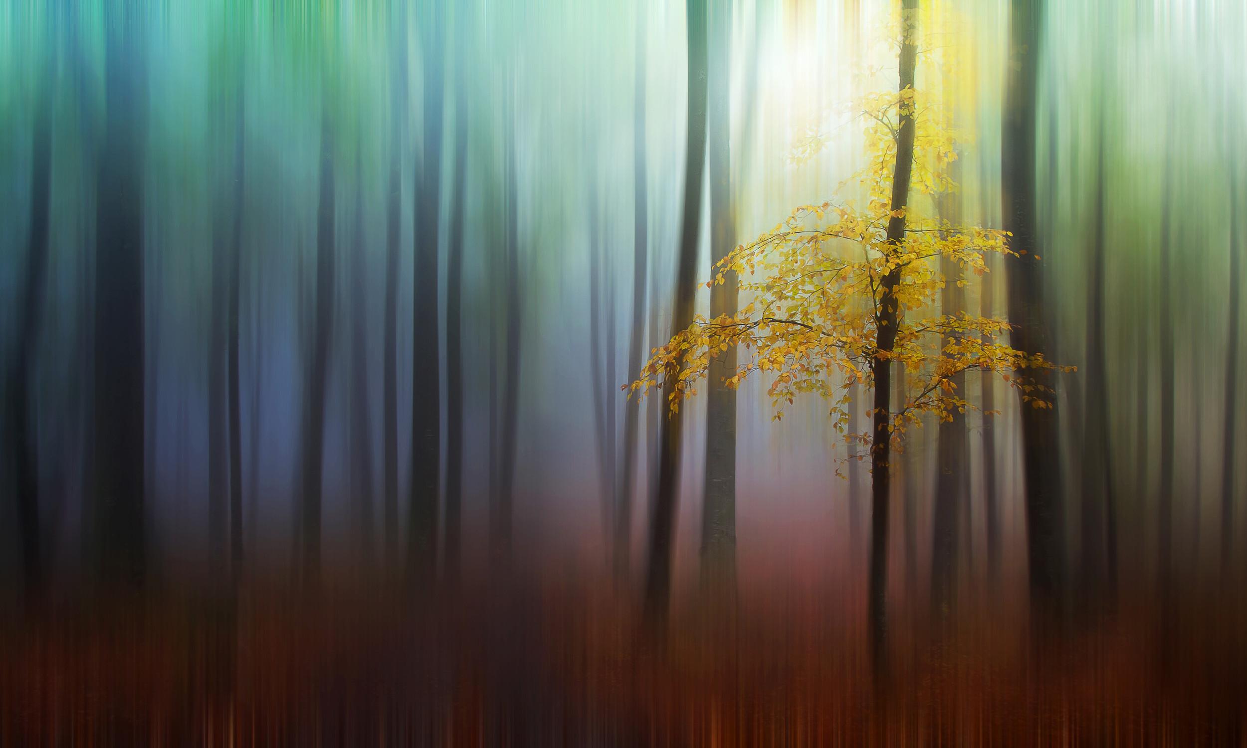 I believe that when you are in front of a scene, you not only see it, but you also focus your mind on a subject in a particular way, and you feel a range of emotions and have thoughts particular to you, as a result of who you are. Each person is different and each of us will experience a given location in a different way. My point here is that the simple image recorded by the camera is not enough to compensate for the moment I experienced back in the forest when I first saw this tree. Of course I could have retouched the original image, leaving out the blur; everyone would have known that the subject was the yellow tree. But I decided to go a few steps further to emphasize this special yellow tree. It is not only a chromatic contrast, but also the feeling I had that this tree in particular was in some way special, different and apart from all the rest, and not just in color and a higher light value.