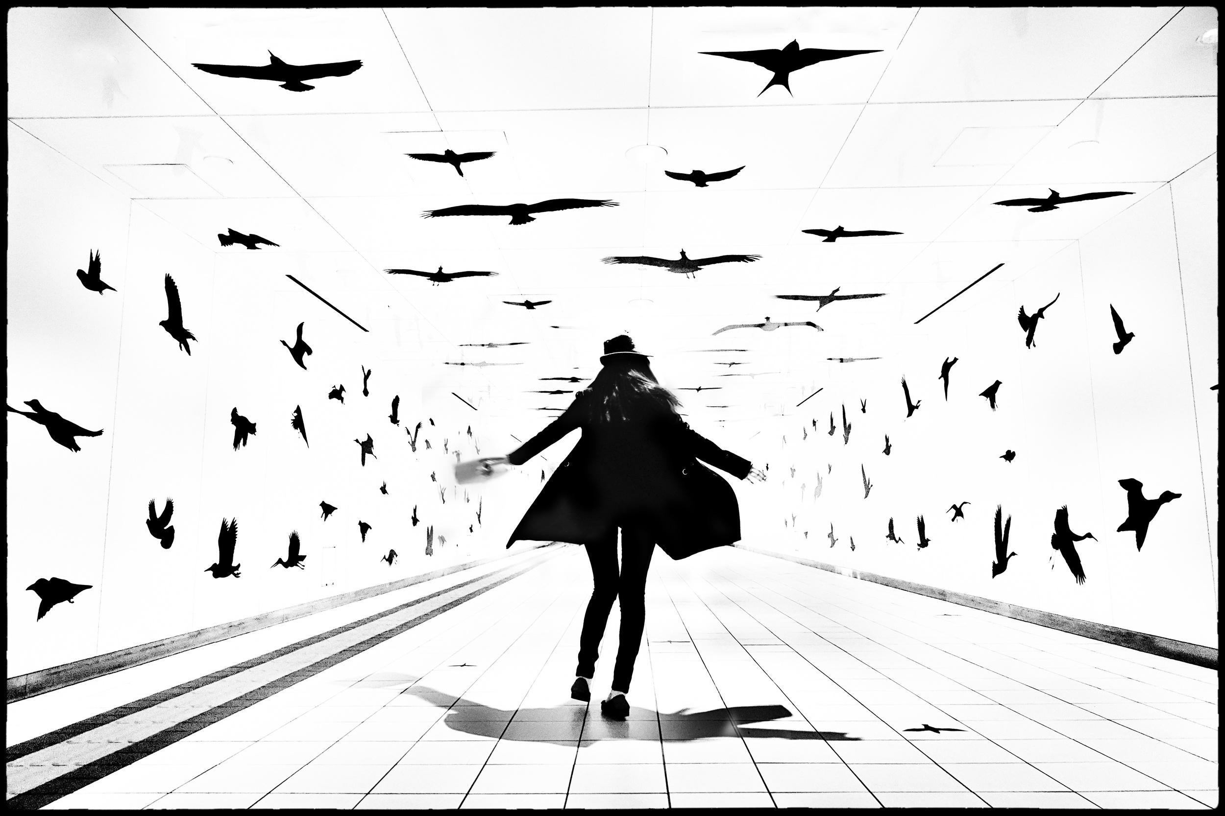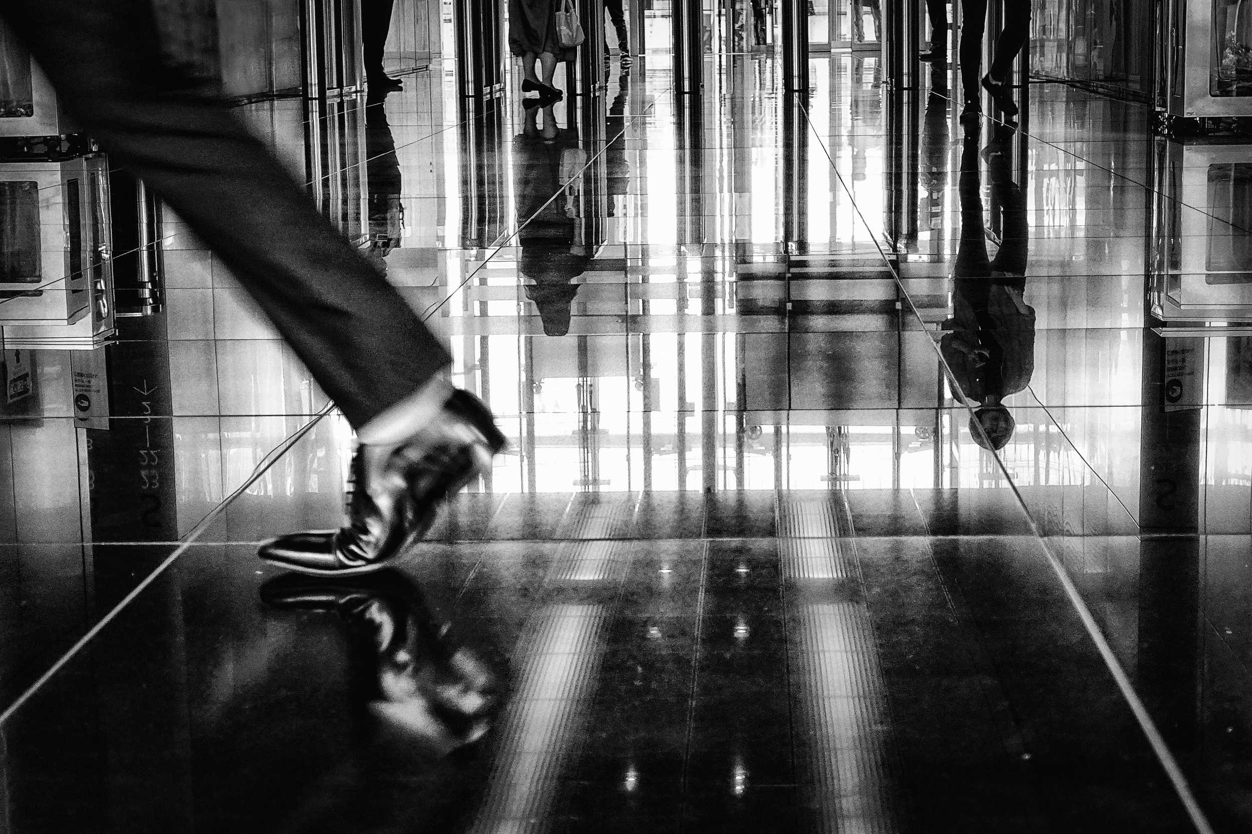 This photo was taken in a building in Tokyo. That day, after walking around Tokyo all day taking pictures, I was exhausted and finally found a chair to sit down and take a break. What caught my eye was the beautiful reflection on the floor. It was one of the many images I got so lost in that I took a lot of shutters!