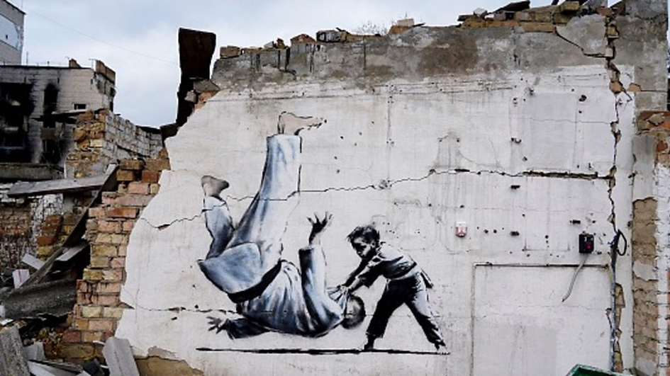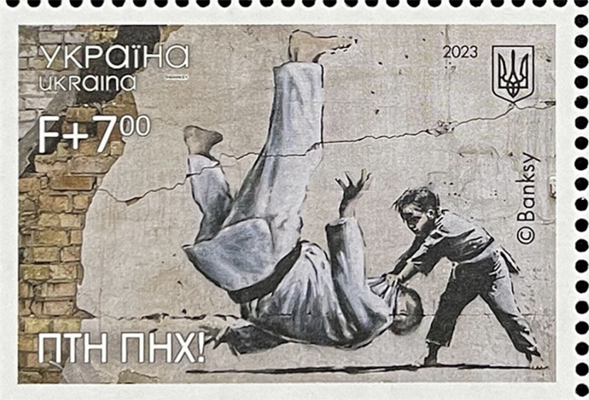 As he was based in Bristol in his early years, a lot of his street art can be seen around the city. This has meant that Bristol has proudly become the “City of Street Art” in the UK. Now his work is also appearing around the world. In November 2022 he posted on social media that there were some of his pictures on damaged buildings in Ukraine following his visit there. After the Russian invasion six murals appeared around the country. One of these images, The Judo Competition, has now been put on a stamp in Ukraine.